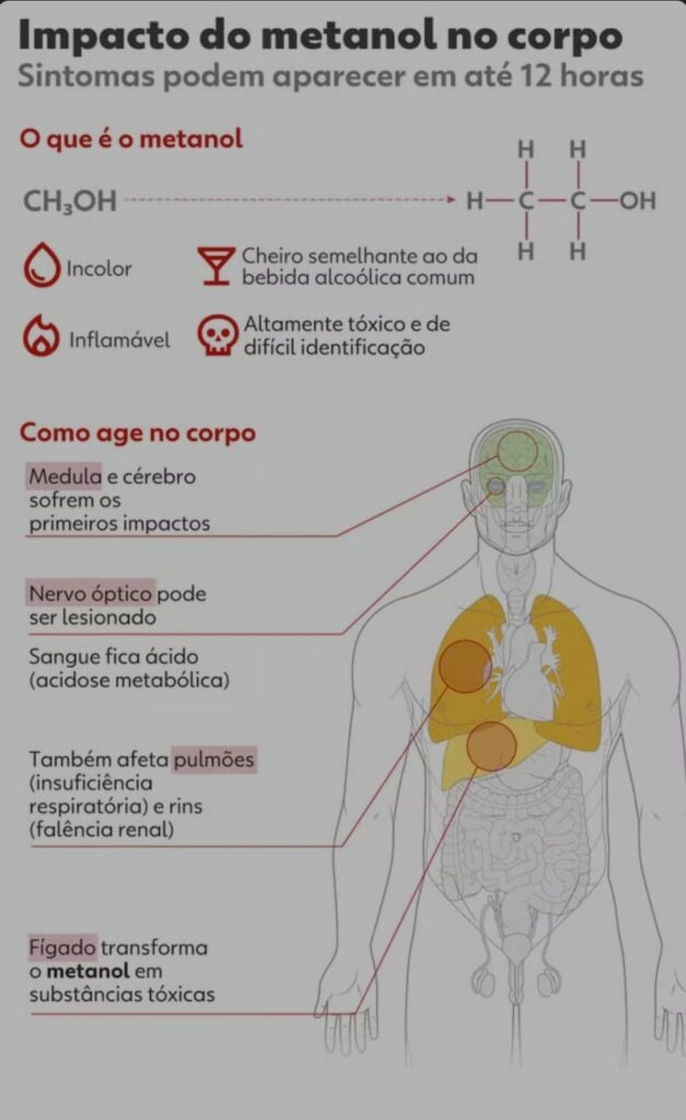 O metanol (CH₃OH), também conhecido como “álcool da madeira”, é uma substância altamente tóxica, incolor e com odor semelhante ao do álcool comum, o que dificulta a identificação em bebidas adulteradas. Embora presente naturalmente em baixíssimas concentrações em frutas e vegetais, quando ingerido em doses elevadas pode causar cegueira, convulsões e morte.